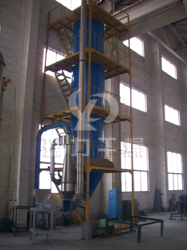 壓力噴霧干燥機工作過程為:料液通過隔膜泵高壓輸入,噴出霧狀液滴,然后同熱空氣并流下降,大部分粉粒由塔底排料口收集,廢氣及其微小粉末經旋風分離器分離,廢氣由抽風機排出,粉末由設在旋風分離器下的收粉筒收集,風機出口處還可裝備二級除塵裝置,回收率在96%-98%。