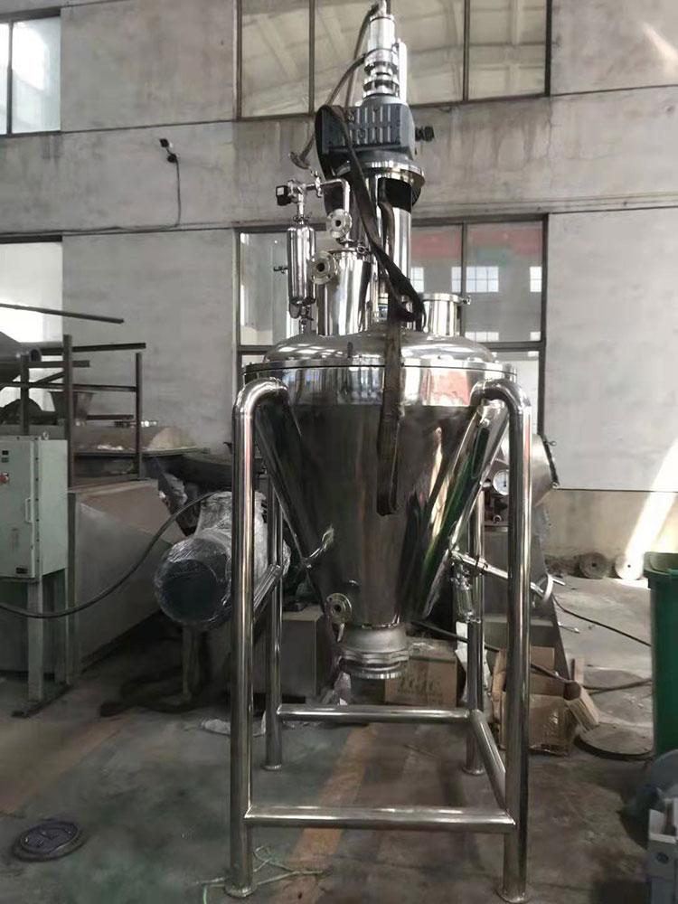 1.單錐真空混合干燥機中的物料在容器內受熱是緊貼容器內壁,由螺旋槳葉自下而上旋轉至容器上部,然后沿主軸呈渦流向下。物料在整個干燥過程中始終在分散運動。物料的運動狀態保證了物料的均衡受熱。